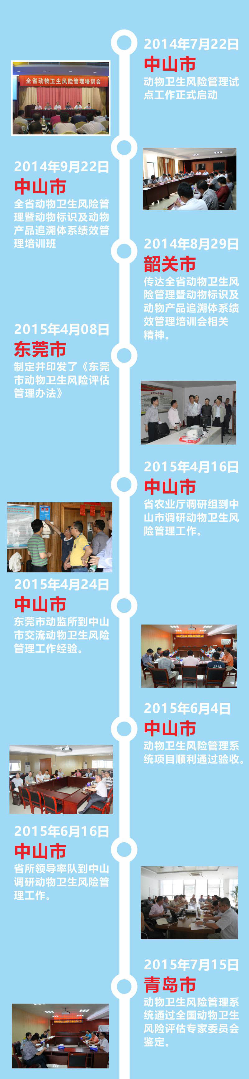 2014年動物衛(wèi)生風(fēng)險管理試點工作在中山市正式啟動,隨后在廣東省動物衛(wèi)生監(jiān)督所的帶領(lǐng)下,東莞、韶關(guān)、河源、惠州、陽江、清遠和雷州等地市相繼開展試點工作,組織執(zhí)法人員參加風(fēng)險管理培訓(xùn)班。2015年動物衛(wèi)生風(fēng)險管理系統(tǒng)在青島市通過全國動物衛(wèi)生風(fēng)險評估專家委員會的鑒定。短短兩年時間內(nèi),動物衛(wèi)生風(fēng)險管理試點遍布廣東省內(nèi) 8個地市。這充分說明動物衛(wèi)生風(fēng)險管理系統(tǒng)的應(yīng)用推廣取得了階段性的成功。廣東省農(nóng)業(yè)廳和廣東省動物衛(wèi)生監(jiān)督所對此給予了高度肯定,并表示,動物衛(wèi)生風(fēng)險管理系統(tǒng)的建立有效提高了工作效率,降低了行政成本,提升了物衛(wèi)生的風(fēng)險控制能力和監(jiān)督管理水平,應(yīng)該在全省范圍內(nèi)推廣。