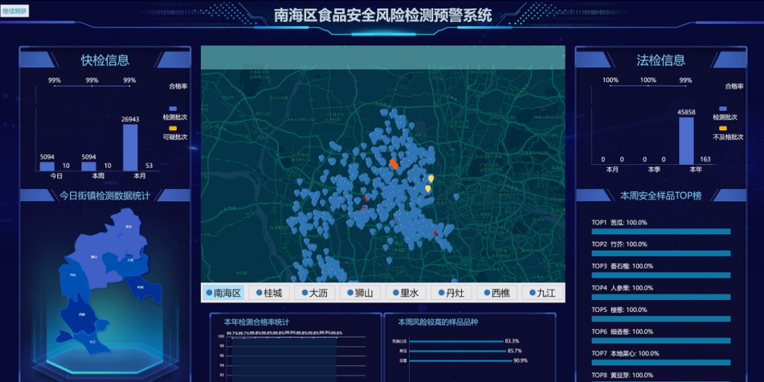 在食品安全風(fēng)險檢測預(yù)警系統(tǒng)平臺首頁,“南海區(qū)食品快檢數(shù)據(jù)”地圖上顯示南海區(qū)900多個監(jiān)測點以及其近一周的檢測情況,另外還設(shè)有“今日鎮(zhèn)街檢測數(shù)據(jù)統(tǒng)計”“本年檢測合格率”“本周風(fēng)險較高的樣品品種”“本周安全用品TOP”榜、“快檢信息”“法檢信息”六大模塊內(nèi)容。