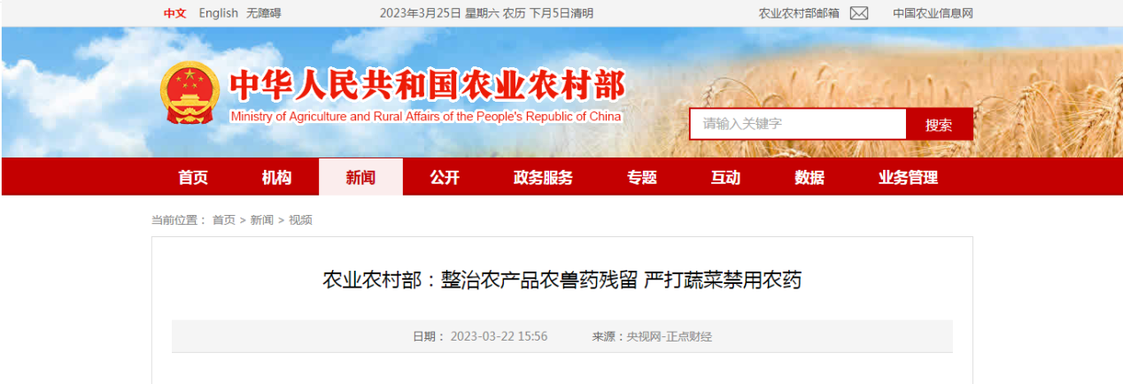 3月21日, 農(nóng)業(yè)農(nóng)村部 ”2023年全國農(nóng)產(chǎn)品質(zhì)量安全監(jiān)管工作會(huì)議“在云南省昆明市召開。會(huì)議表示,針對(duì)一些農(nóng)產(chǎn)品農(nóng)獸藥殘留方面的突出問題將在嚴(yán)打蔬菜禁用農(nóng)藥源頭上下功夫。據(jù)介紹,2022年全國農(nóng)產(chǎn)品監(jiān)測(cè)合格率達(dá)到97.6%,農(nóng)產(chǎn)品質(zhì)量安全形勢(shì)持續(xù)向好。但是,農(nóng)產(chǎn)品質(zhì)量安全隱患依然不少,禁用藥物的違法使用雖有下降但并未杜絕,防止常規(guī)農(nóng)藥超標(biāo)成為新時(shí)期的重要任務(wù)。