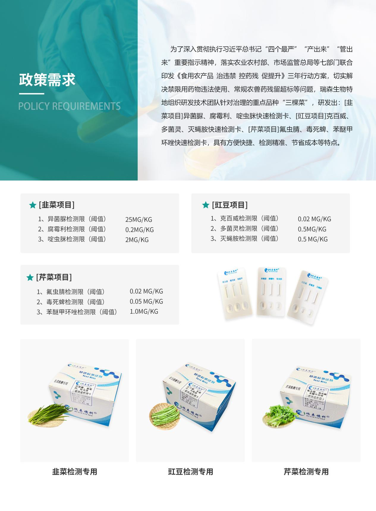 瑞森生物認(rèn)真學(xué)習(xí)和貫徹農(nóng)業(yè)農(nóng)村部2023年全國農(nóng)產(chǎn)品質(zhì)量安全監(jiān)管工作會(huì)議精神,積極擁護(hù)和響應(yīng)《中華人民共和國食品安全法》。早在2021年國家農(nóng)業(yè)農(nóng)村部發(fā)布了《食用農(nóng)產(chǎn)品“治違禁 控藥殘 促提升”三年行動(dòng)方案》的通知后,瑞森生物就積極擁護(hù)和響應(yīng)文件精神,并針對(duì)《方案》中提到的需要重點(diǎn)治理的11種農(nóng)產(chǎn)品:“三棵菜”、“一枚蛋”、“一只雞”、”肉牛肉羊“、“四條魚”,推出了相關(guān)的新品應(yīng)對(duì)方案,包括”農(nóng)藥殘留膠體金多聯(lián)檢測(cè)產(chǎn)品系列“、”禽蛋藥殘專項(xiàng)檢測(cè)解決方案“、”熒光定量快速檢測(cè)產(chǎn)品“等相關(guān)技術(shù)領(lǐng)先的新型檢測(cè)產(chǎn)品。有效解決了國家食用農(nóng)產(chǎn)品存在的安全隱患問題,充分保障了老百姓”菜籃子“上的安全。