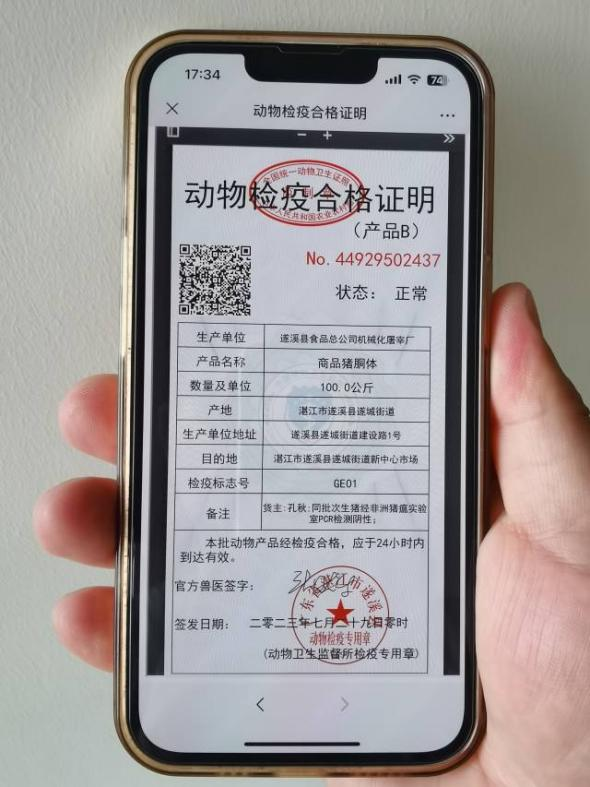 7月29日凌晨12點(diǎn)57分,遂溪縣食品總公司機(jī)械化屠宰廠的駐場(chǎng)官方獸醫(yī)開出了湛江市首張動(dòng)物檢疫合格證明(產(chǎn)品B)電子證照,這是繼本月初無(wú)紙化出具動(dòng)物B證后,湛江市動(dòng)物檢疫工作在信息化建設(shè)上又一次新的突破;標(biāo)志著湛江市動(dòng)物檢疫合格證明無(wú)紙化改革工作、全鏈條檢疫追溯監(jiān)管體系建設(shè)又邁出了歷史性的一步,成為全省首個(gè)在產(chǎn)地檢疫與屠宰檢疫環(huán)節(jié)同時(shí)實(shí)現(xiàn)無(wú)紙化出證的地級(jí)市。