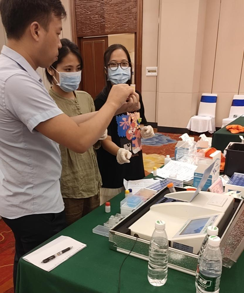 本次培訓班會議瑞森生物的培訓工作大致分為三個部分,一是食用農(nóng)產(chǎn)品快檢技術(shù)培訓理論授課講解,二是農(nóng)殘、獸殘操作規(guī)范培訓的理論授課講解,三是食用農(nóng)產(chǎn)品快檢技術(shù)的實操培訓。在食用農(nóng)產(chǎn)品快檢技術(shù)培訓理論講解課上,瑞森生物技術(shù)副總羅奕銘先生為與會人員講解了“快檢技術(shù)的應用”、“2000家農(nóng)貿(mào)市場工作要求文件解讀”、“快檢工作存在的問題”、“快檢考核的要點”等相關(guān)理論知識;在農(nóng)殘、獸殘操作規(guī)范培訓的理論授課上,瑞森生物技術(shù)經(jīng)理林桂明先生為與會人員講解了“農(nóng)殘酶抑制法及膠體金檢測技術(shù)”、“檢測的注意事項及規(guī)范操作”等相關(guān)理論知識。兩位同事的講課內(nèi)容深入淺出,受到了現(xiàn)場與會人員的一致好評,并取得良好效果。