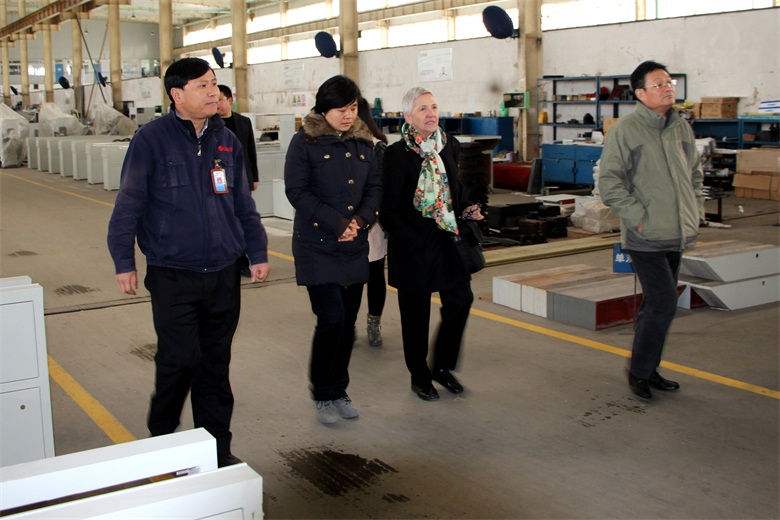 在參觀鋁機(jī)總裝車間時(shí),Bernice Herris副校長(zhǎng)對(duì)我公司目前處于國(guó)內(nèi)領(lǐng)先水平的鋁機(jī)產(chǎn)品表示了充分肯定,并對(duì)其研發(fā)、工藝流程進(jìn)行了詳細(xì)詢問,公司生產(chǎn)副總亓愛林對(duì)考察團(tuán)提出的問題一一作了解答。