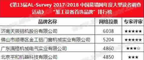 “天辰股份”憑借其雄厚的技術(shù)實力和品牌影響力,最終贏得廣大終端客戶、行業(yè)專家、設計院、顧問公司和媒體總編的高度認可,在第13屆AL-Survey2017-2018中國門窗幕墻行業(yè)大型讀者調(diào)查暨“我最喜愛品牌”評選活動中,成功衛(wèi)冕“加工設備首選品牌”大獎!